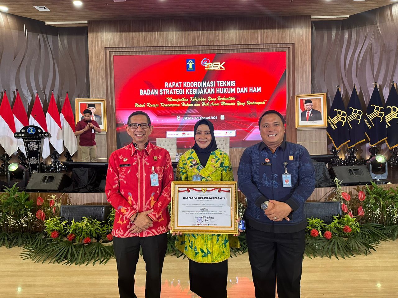 Penghargaan tersebut diserahkan langsung oleh Plh. Sekretaris Jenderal Kementerian Hukum dan HAM RI, Dr. Reynhard Silitonga kepada Kepala Kantor Wilayah Kementerian Hukum dan HAM Sulawesi Tengah, Hermansyah Siregar.