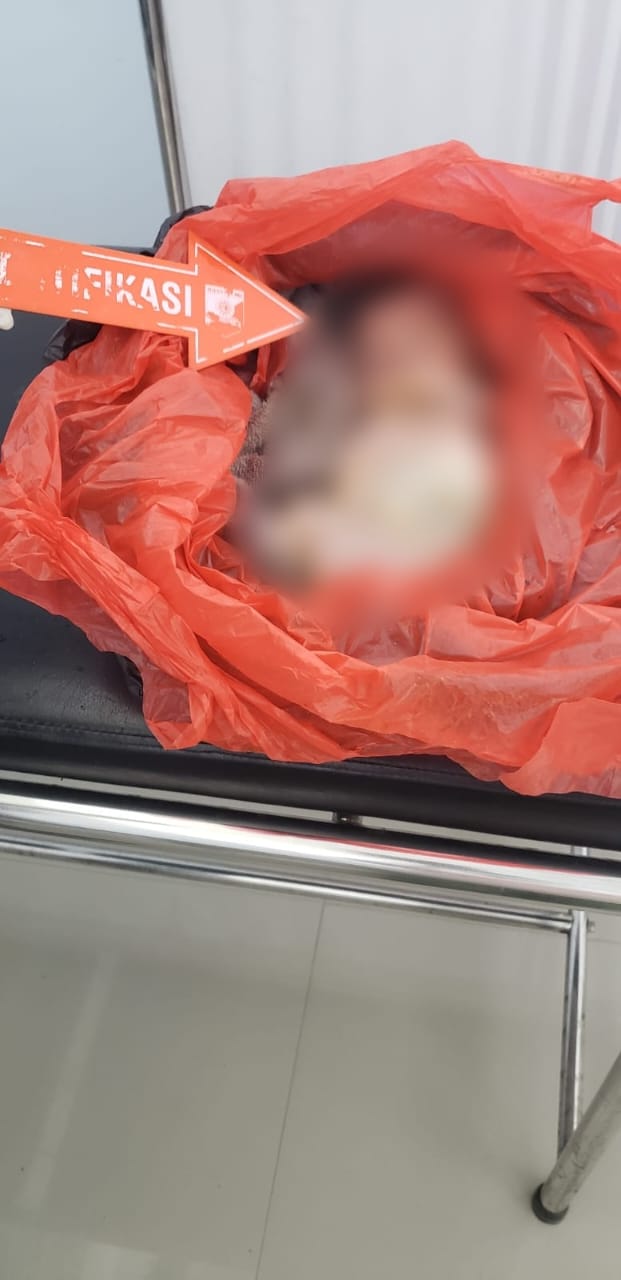 Sosok mayat bayi berjenis kelamin laki-laki itu ditemukan sudah dalam keadaan tidak bernyawa dengan posisi badan terlentang dan dibungkus menggunakan Kantongan plastik berwana merah dilapisi Kantongan plastik warna hitam