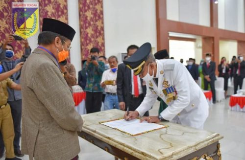 BIDIKSULTENG.COM- Gubernur Sulawesi Tengah (Sulteng), Longki Djanggola, melantik Bupati Banggai Kepulauan (Bangkep) sisa masa jabatan 2017-2022, H.Rais.D Adam di Gedung Pogombo kantor Gubernur Sulteng.jalan Samratulangi,Palu, Selasa (30/07).