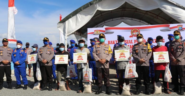 BIDIKSULTENG.COM, PALU – Sebanyak 600 paket sembako kembali dibagikan Polda Sulteng menyambut HUT Bhayangkara ke-74 tahun 2020 yang saat ini giliran warga Wani Kabupaten Donggala yang dikunjungi Kapolda Sulteng Irjen Pol. Drs. Syafril Nursal, SH, MH Bersama rombongan.