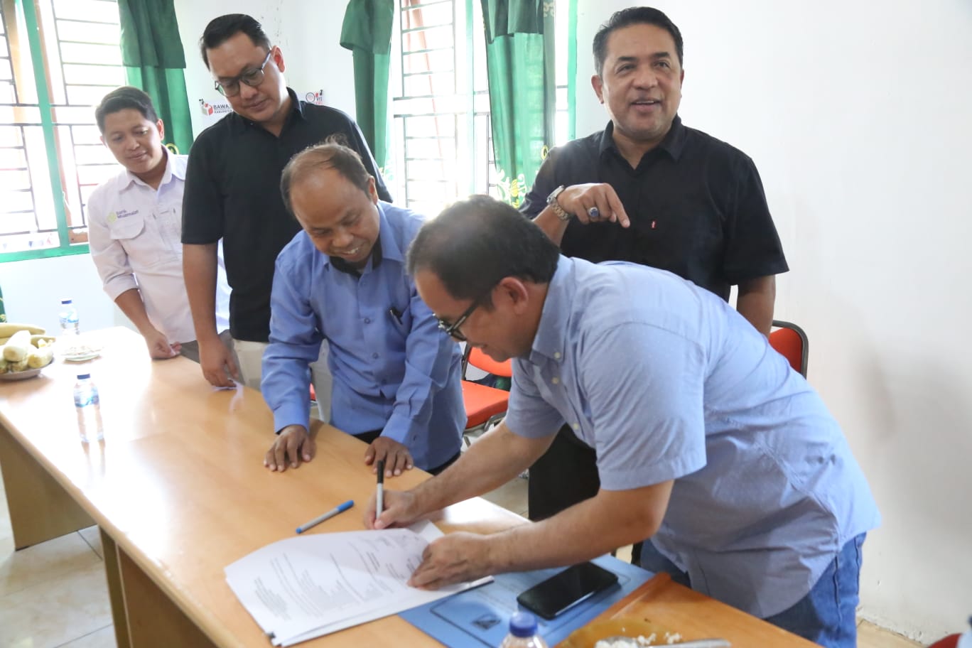 Penyerahan dukungan Peningkatan Kwalitas Konsumsi Makanan Guna Meningkatkan Kwalitas Gizi baik Kepada Keluarga dan Anak Anak, Kaban Kesbang Pol , Karo Hukum , BPJS Ketenaga Kerjaan dan Bank Muamalat , didampingi Kaban Kesbangpol Sigi, Kabag Hukum Sigi , Camat Dolo Barat dan 4 Kepala Desa Mitra Binaan.