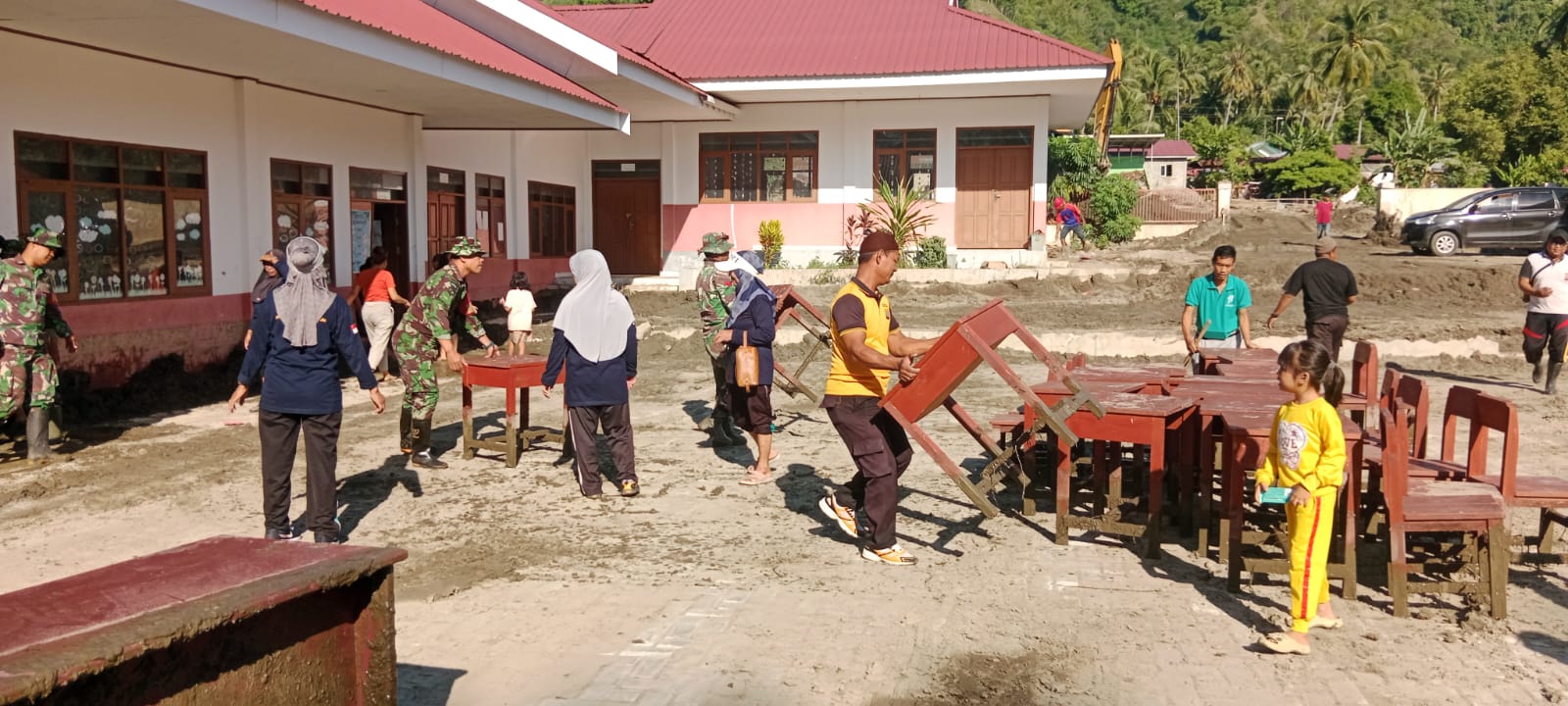 Kegiatan kerja bakti kali ini dilaksanakan di SDN Balongga Kecamatan Dolo Selatan, guna membersihkan material lumpur di dalam gedung sekolah dan lingkungan sekitarnya.
