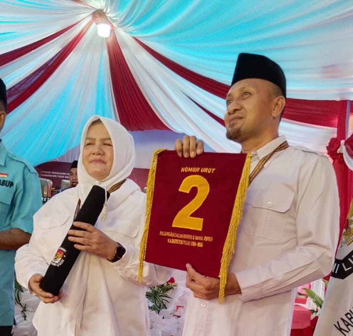 Bidiksulteng.com,Touna – Pasangan Calon Bupati Dan Wakil Bupati yang ber tagline “IHLAS”telah mendapatkan No Urut 2 saat penetapan di KPUD Tojo Una-Una Senin 23 September 2024.