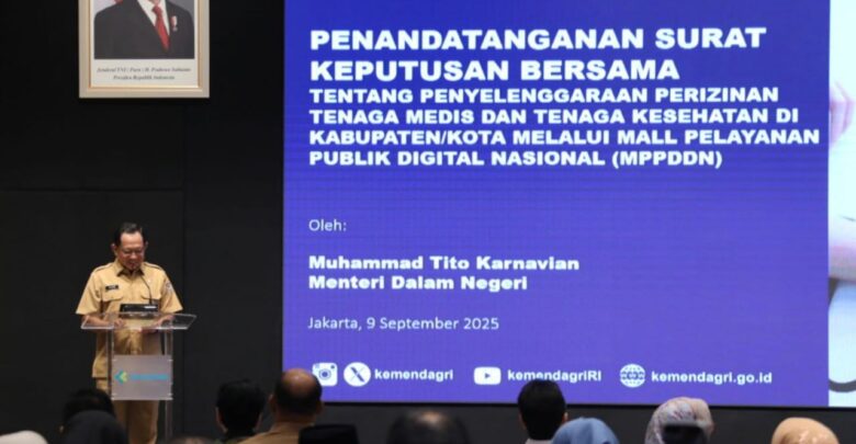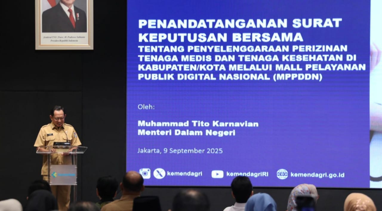 Bidiksulteng.com,Jakarta – Menteri Dalam Negeri (Mendagri) Muhammad Tito Karnavian menyatakan dukungannya terhadap kebijakan perizinan tenaga medis dan kesehatan melalui Mal Pelayanan Publik Digital Nasional (MPPDN). Hal itu disampaikan Mendagri pada acara Penandatanganan Surat Keputusan Bersama tentang Penyelenggaraan Perizinan Tenaga Medis dan Tenaga Kesehatan di Kabupaten/Kota melalui MPPDN di Gedung Adhyatma, Kementerian Kesehatan (Kemenkes), Jakarta, Selasa (9/9/2025).