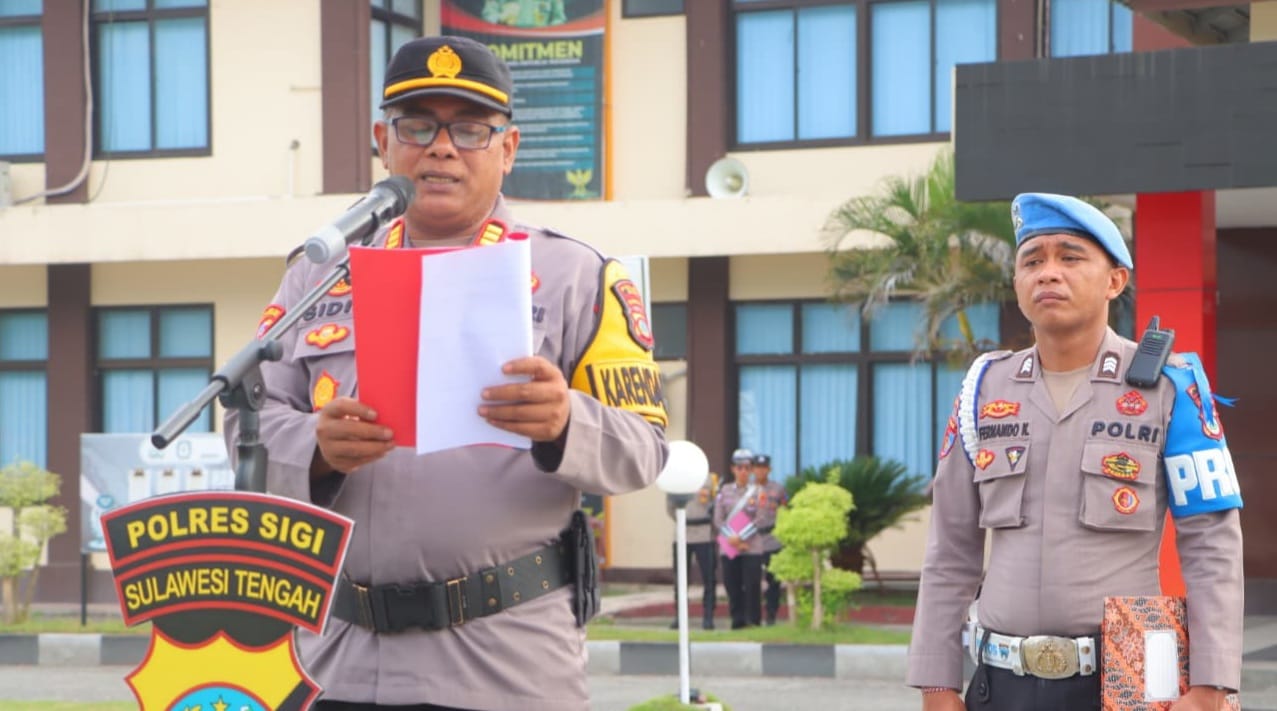 Apel tersebut dipimpin Kapolres Sigi AKBP Kari Amsah Ritonga, S.H., S.I.K., M.H., yang diwakili Kabag Ops Polres Sigi AKP Sidik Mashudiyanto, S.A.P., serta diikuti para Pejabat Utama (PJU) dan seluruh personel Polres Sigi.