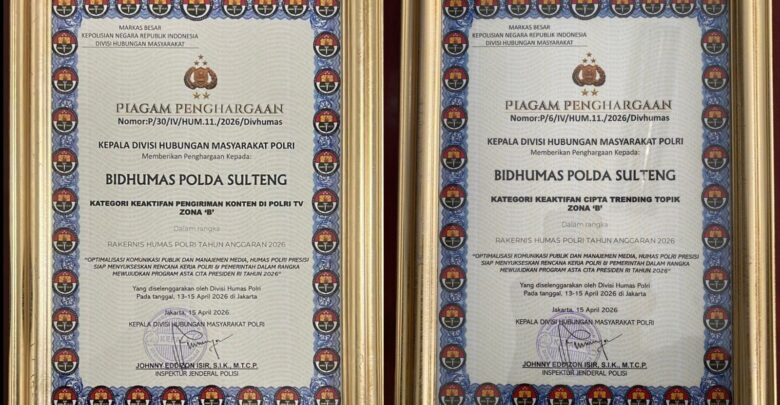 Bidiksulteng.com,Jakarta — Bidang Hubungan Masyarakat (Bidhumas) Polda Sulawesi Tengah meraih dua penghargaan pada Rapat Kerja Teknis (Rakernis) Humas Polri Tahun Anggaran 2026 yang digelar di Jakarta. Penghargaan diserahkan langsung oleh Kepala Divisi Humas Polri, Irjen Pol Jonny Eddizon Isir.